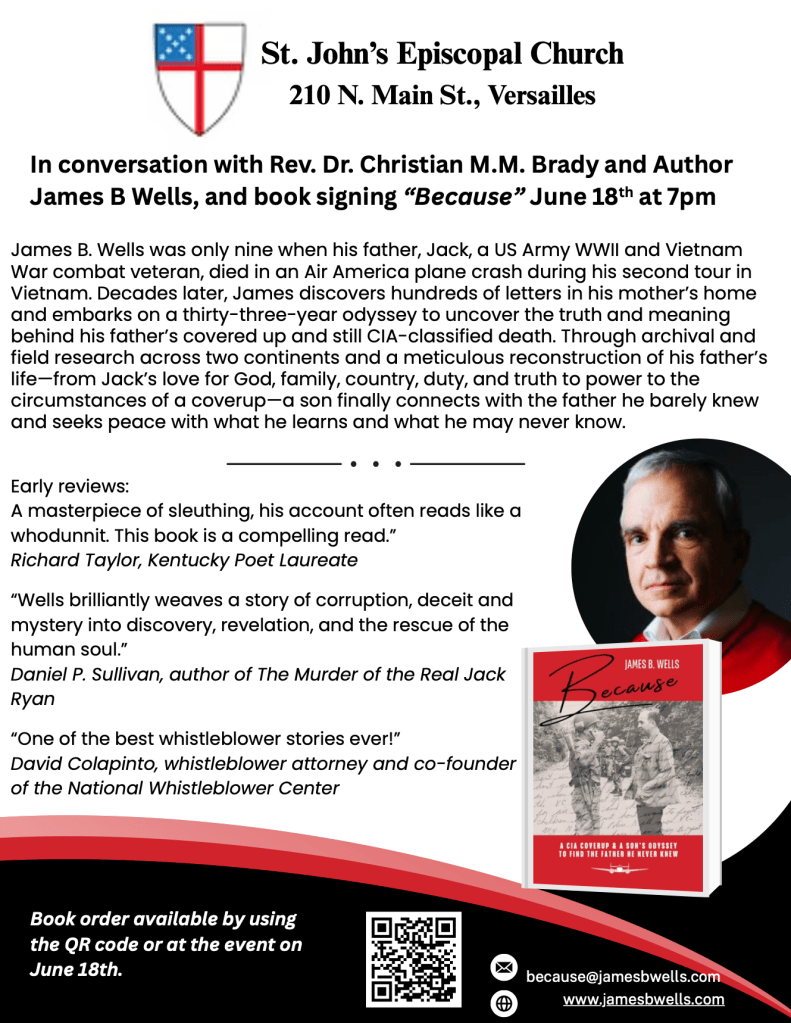 Tomorrow, I will revisit with some key characters from my investigative memoir at one of the actual scenes where incredible revelations from “Because: A CA Coverup and A Son’s Odyssey to Find the Father He Never Knew” were brought to light. Join us at St. John’s Episcopal Church in Versailles, KY, located at 210 N. Main Street, at 7 pm, where Rev. Dr. Christian M.M. Brady will lead the discussion.