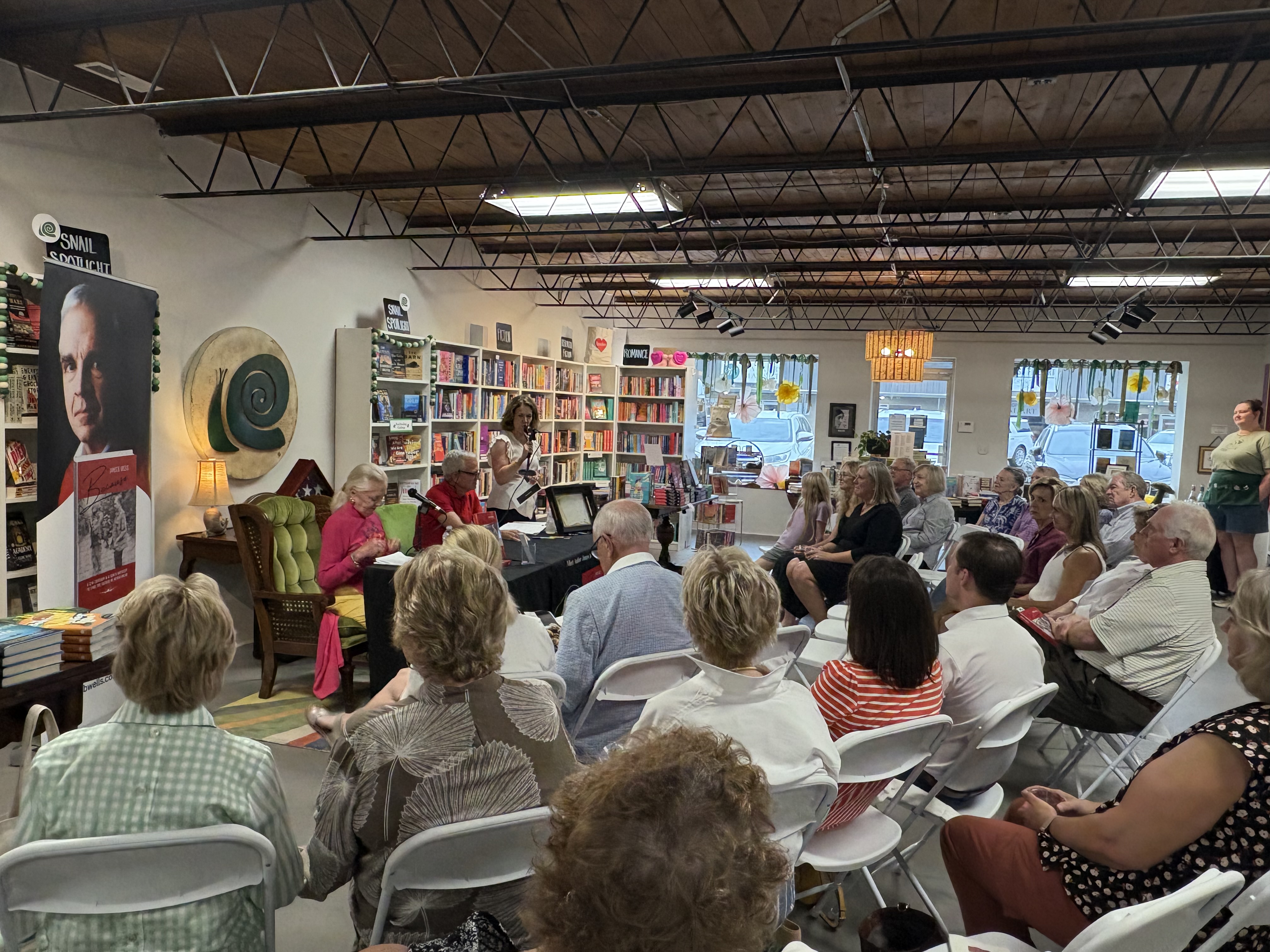 We had a full house at Snail on the Wall Bookstore in Huntsville, AL last night, where I engaged in conversation with my sister Kathleen. We discussed my investigative memoir, Because: A CIA Coverup and a Son’s Odyssey to Find the Father He Never Knew. Kathleen, a former English literature teacher, prompted me to read and respond to questions that corresponded to each step of the archetypal hero’s journey, drawing parallels to characters such as Odysseus, Frodo, Moses, Harry Potter, and Luke Skywalker. Brenda and I would like to express our gratitude to Kathleen, Lady Smith, Christina Tabereaux, and the staff at Snail on the Wall for making the event a truly unique reading and signing experience.