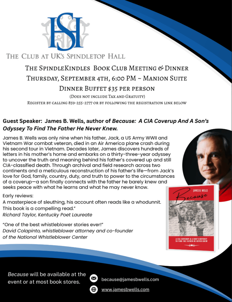 I am super excited about this author event with SpindleKindles Book Club at Spindletop Hall on September 4th. Interest has grown so much that the Alumni Club Member Services Director has had to switch to a buffet-style dinner to serve everyone more efficiently. Given that this event is the first one of our fall tour (we took a few weeks off after finishing our summer tour), it’s also extra special to me because of the critical University of Kentucky (UK) connection to my investigative memoir about my father’s still CIA-classified death in Vietnam. Vietnam War scholar George C. Herring (now deceased), UK Alumni Professor of History Emeritus, was the VERY FIRST person I formally interviewed, way back in January 2013. I fondly recall the lunch we had, where he pointed me in the right direction regarding the declassified files I should examine in the National Archives. His book, America’s Longest War: The United States and Vietnam, 1950–1975, is a widely recognized history of the Vietnam War.