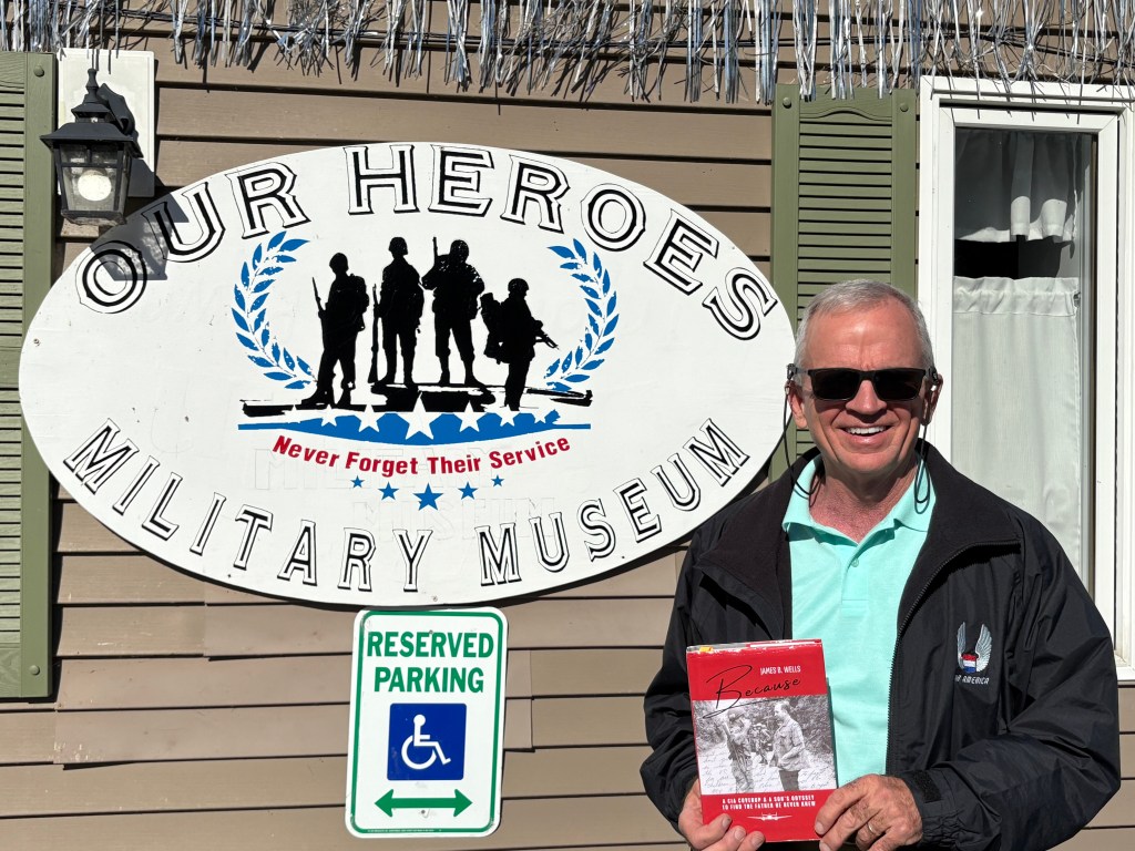 Our last event in Maine was at Our Heroes Military Museum in Lincoln. This is an incredible museum, all run by volunteers, most of whom are veterans. The veterans who attended the author event for my investigative memoir, Because: A CIA Coverup and a Son’s Odyssey to Find the Father He Never Knew, asked some great questions and really appreciated my story and book tour. Incredibly, they all bought hardbacks instead of paperbacks. When I asked why, they all said, “It’s because we’re all collectors!” Duh! What would you expect from veterans who collect various memorabilia to put in a military museum?