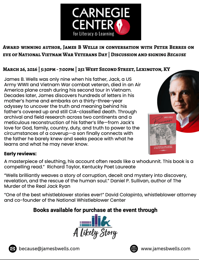His investigative memoir about his father's still CIA-classified death in Vietnam in 1965, titled Because: A CIA Coverup and a Son’s Odyssey to Find the Father He Never Knew, will be launched on Father's Day weekend, 2025. Links to publications, presentations, trailers, social media, blog, and other information can be found at https://jamesbwells.com. James enjoys spending much of his leisure time with his spouse on their Lexington, Kentucky farm located on the palisades of the Kentucky River, where he is an organic gardener and beekeeper.
