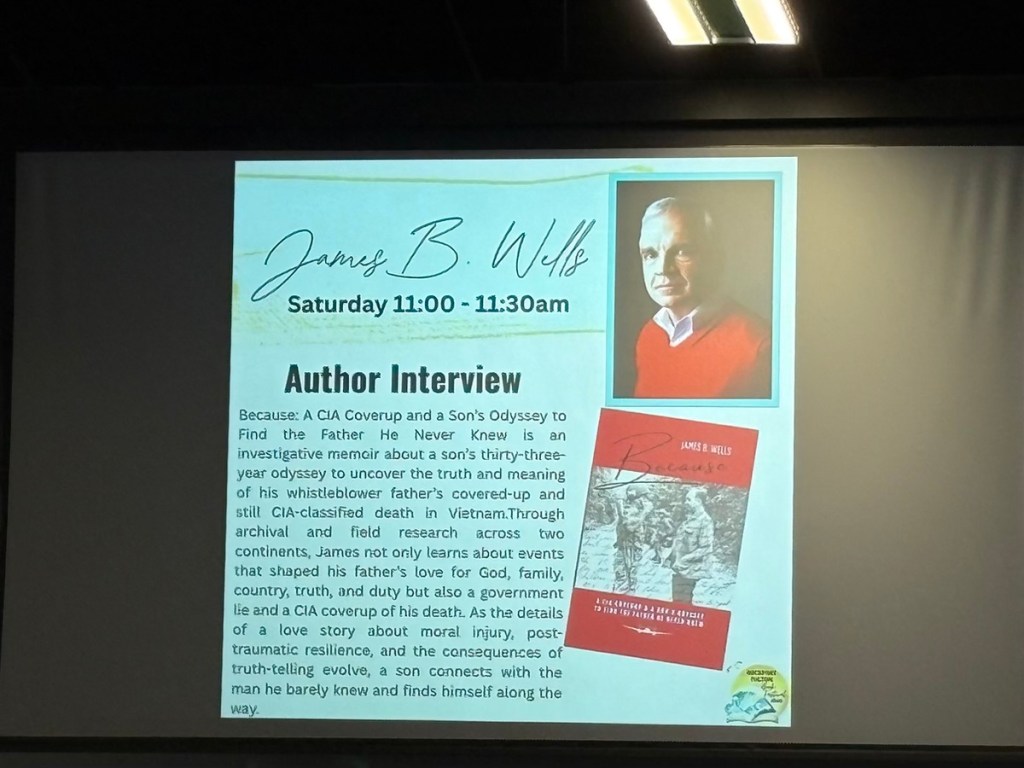 The Rockport Fulton Book Festival overlooking Arkansas Bay in Texas has been one of the most rewarding and well-organized book festivals Brenda and I have attended. The festival began with an onstage interview about my investigative memoir, Because: A CIA Coverup and a Son’s Odyssey to Find the Father He Never Knew. Later that afternoon, I joined a nonfiction panel with three other authors. On the first day of this two-day festival, I broke my personal record for book sales. The event drew a large crowd both days, and the organizers’ promotion and support were outstanding. Breakfast, lunch, and snacks were generously provided to authors throughout the event. Brenda and I met dozens of incredible people who showed genuine interest in my book, and the conversations we had were truly priceless. We will definitely be back!